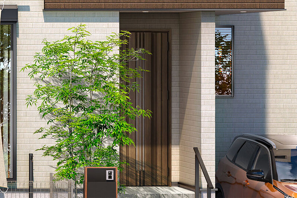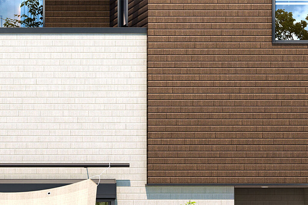 外壁のアクセントにスクラッチタイル柄を添えたファサード。窓の形状やインナーバルコニーが表情を豊かに仕上げています。雨で汚れを洗い落とすセルフクリーニングする外壁です。