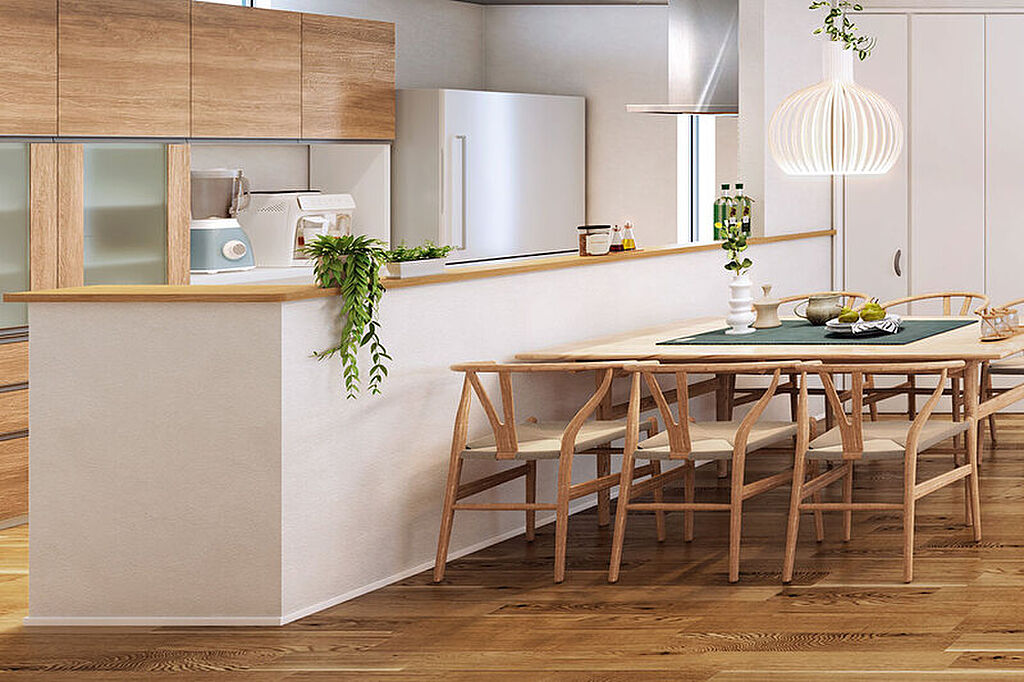 お料理中もご家族とのコミュニケーションを取りやすい対面キッチン。キッチンにいながら、部屋の隅々まで目が行き届き、小さなお子様のいるご家族も安心です。