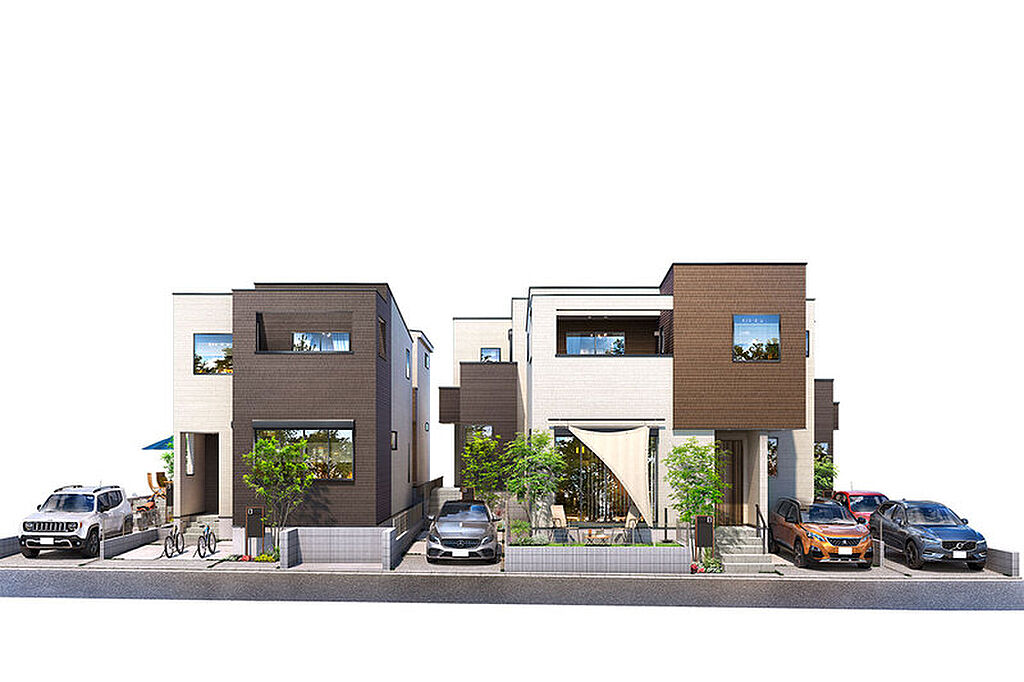 【洗練さを漂わせる全5邸の街】スタイリッシュな濃淡のコントラストが目を惹く5邸の住まい。庭やカースペースを設けることで広がりとともに陽だまりスペースを確保し、爽やかな陽光を暮らしに導いています。