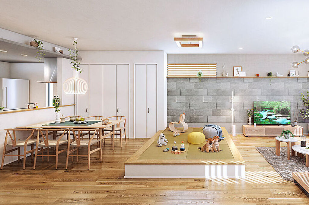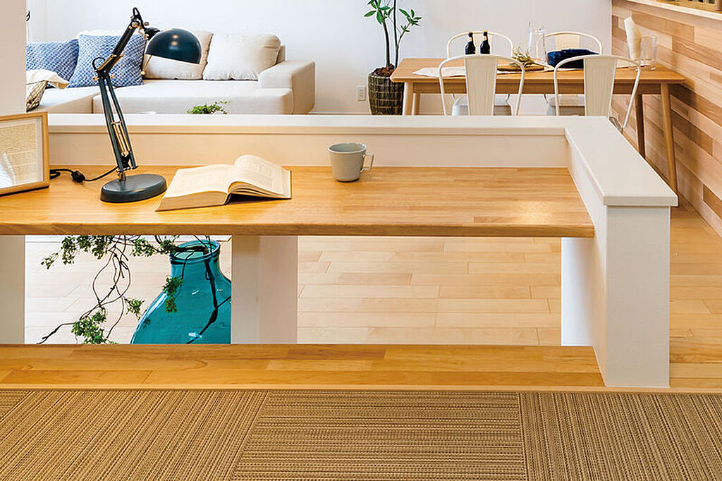 LDKの中央に小上がりのタタミスペースを設けました。段差を生かして腰掛けながら、家族とつながり、ゆったり憩えます。※号棟により採用状況が異なります。