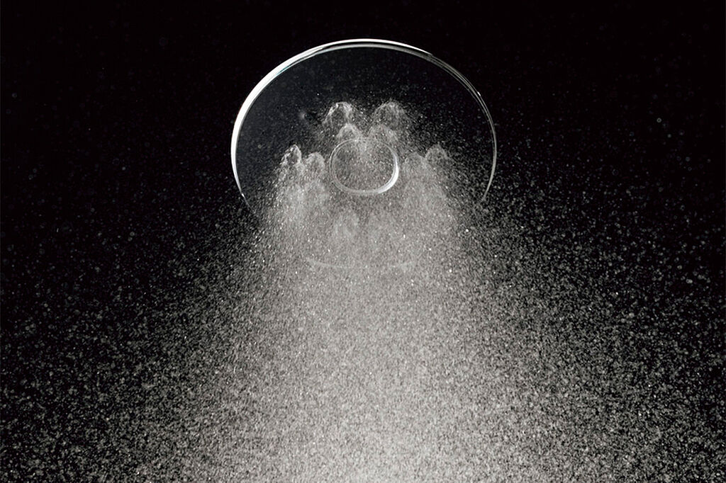 散水板の穴の大きさや位置の工夫と、水滴にたっぷりの空気を含ませることで、ボリュームのある浴び心地と節水の両立を実現しました。