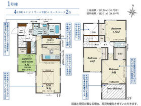 土地面積土地:169.73m2(約51.34坪)〜170.75m2(約51.65坪) 建物:106.40m2(約32.18坪)〜111.16m2(約33.62坪)