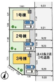 土地面積土地:1号棟:133.80m2 2号棟:133.80m2 3号棟:134.46m2 建物:1号棟:107.59m2 2号棟:107.44m2 3号棟:107.43m2