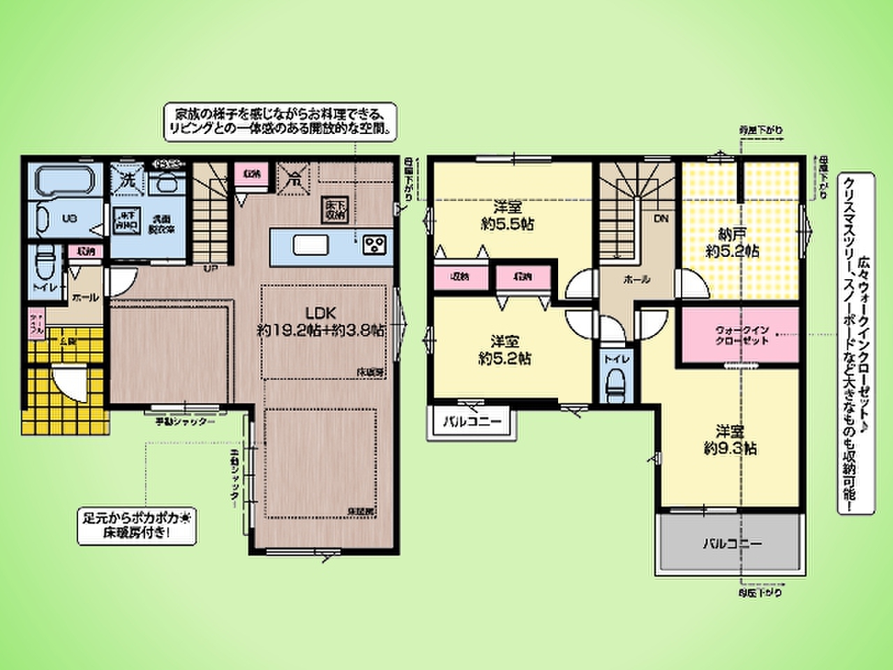 間取り3LDK+S(納戸)・5LDK:1号棟+WIC/2号棟+WIC×2