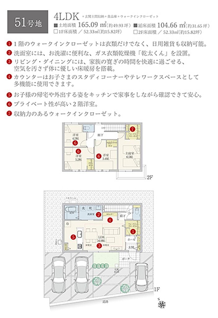 | 建物面積 | 108.81m2(46号地)、105.49m2(49号地)、104.66m2(51号地) | 土地面積 | 169.48m2(46号地)、166.57m2(49号地)、165.09m2(51号地) 私道負担なし | ||