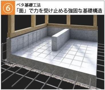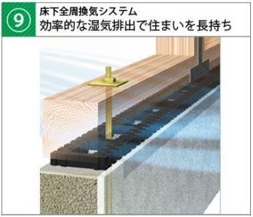基礎と土台の間に硬質樹脂のパッキンを設置。基礎の全周からスムーズに新鮮な空気を取り入れることで、床下の高い換気効率を実現。湿気がこもることによる建物土台の腐食を防止し、住まいを長持ちさせます。