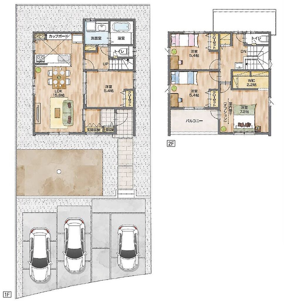 | 建物面積 | No.1No.2ともに 100.19m2(30.30坪) | 土地面積 | No.1 200.64m2(60.69坪)/No.2 188.39m2(56.98坪) | ||