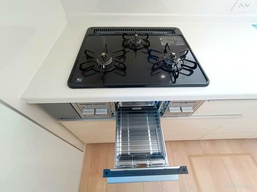 | 設備 | 収納スペース・追焚機能・プロパンガス・フローリング・浴室乾燥機・Wクロゼット・シャンプードレッサー・ウォシュレット・システムキッチン・モニタ付インターホン・クロゼット・トイレ2ヶ所・床下収納・複層ガラス・ディンプルキー・上水道・下水道・防犯カメラ | ||||