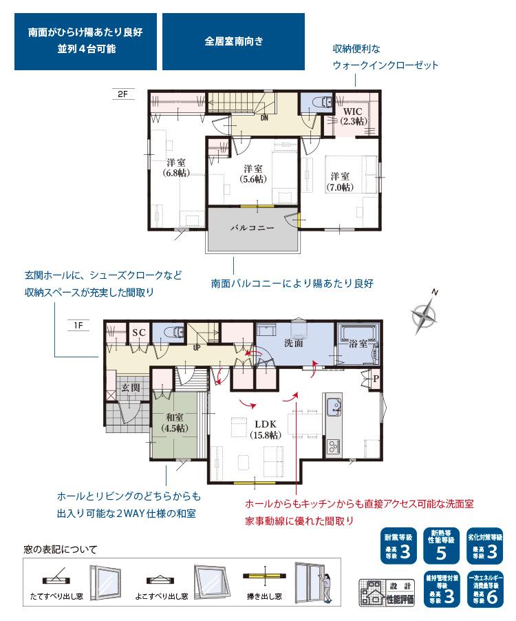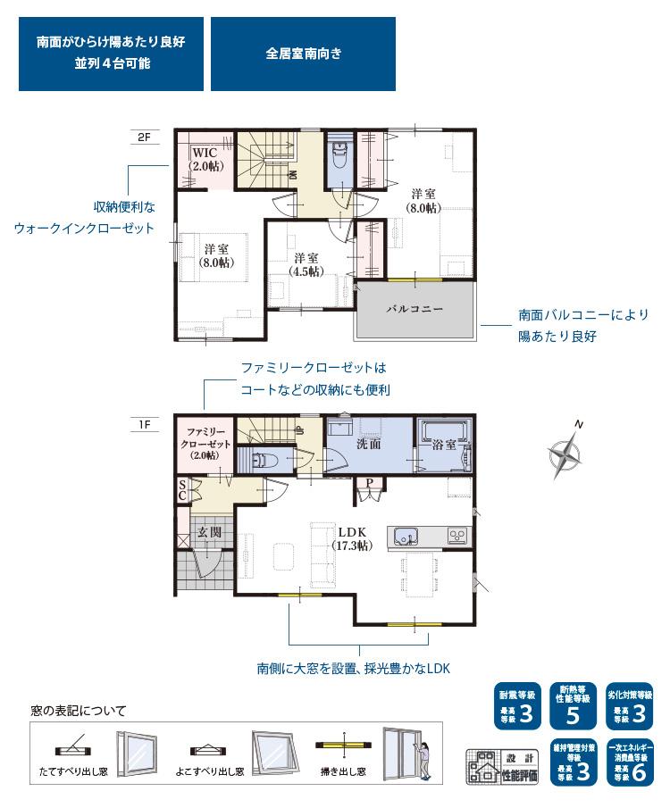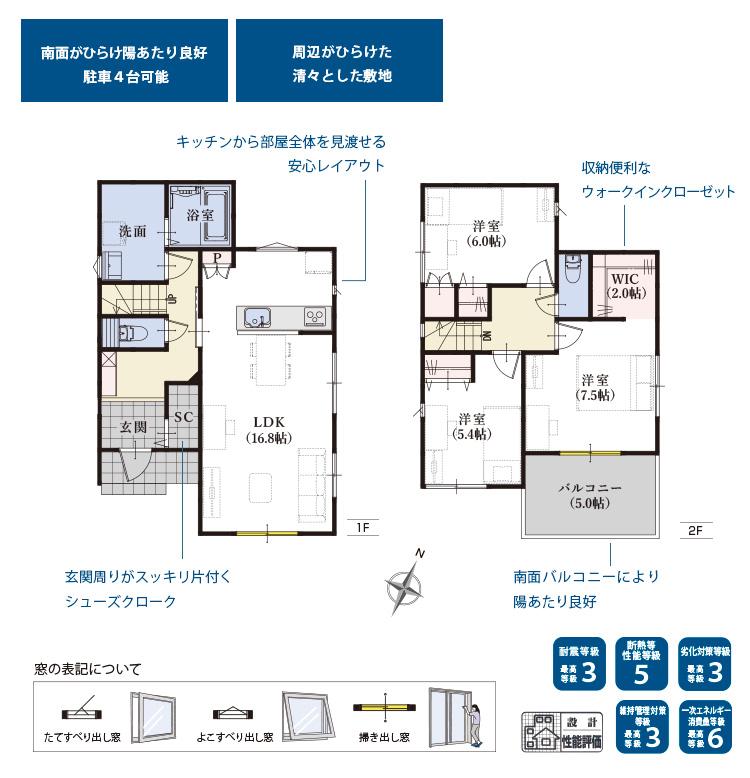 | 設備 | 設計住宅性能評価書 / BELS/省エネ基準適合認定書あり / フラット35・S適合証明書 / フラット35Sに対応 / 地盤調査済 / 駐車3台以上可 / LDK18畳以上 / 南向き / システムキッチン / 陽当り良好 / 全居室収納 / 前道6m以上 / 和室 / 整形地 / 対面式キッチン / トイレ2ヶ所 / 浴室1坪以上 / 2階建 / 南面バルコニー / 通風良好 / 全居室フローリング / ウォークインクローゼット / 都市ガス / シューズインクローク / 平坦地 / 可動間仕切り | ||||