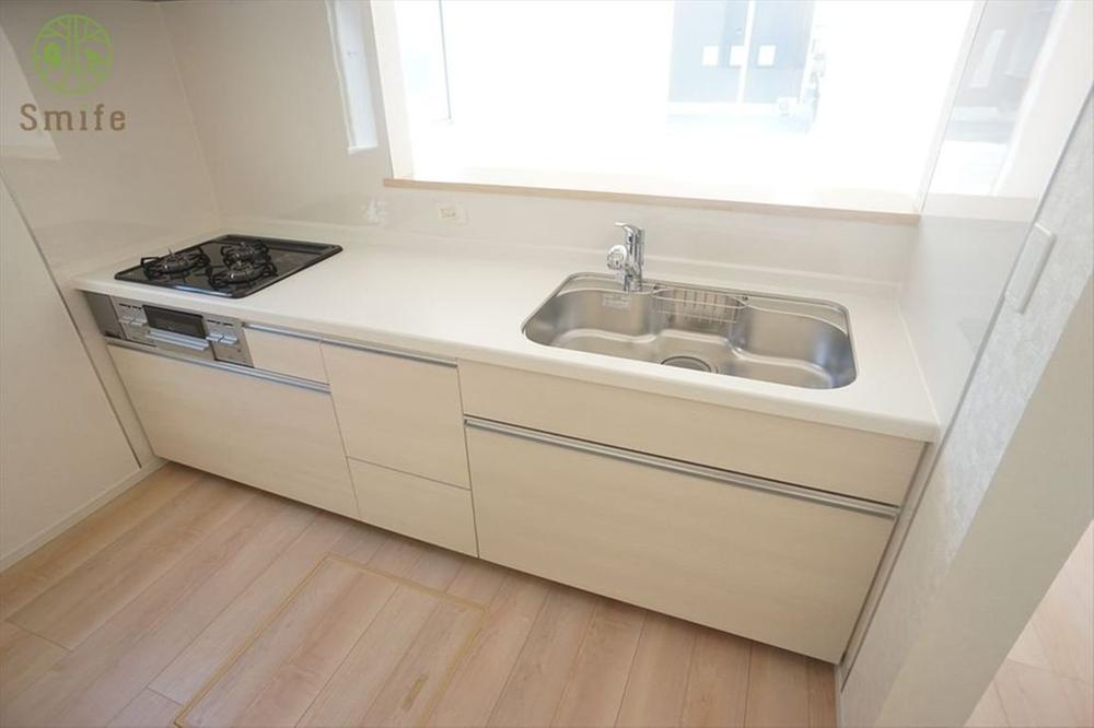 広々シンクのカウンターシステムキッチンです。システムキッチンですから、通常のキッチンに比べ、シームレスでお掃除がしやすいですし、リビングからの採光とキッチン壁面からの採光で、明るい雰囲気です。