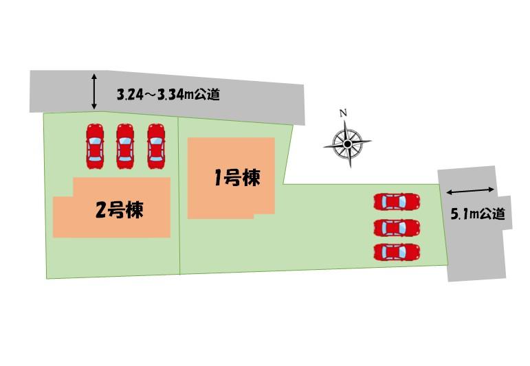 | 地目 | 宅地 | 道路付け | 道路幅:3.2m~5.1m、アスファルト舗装、北側3.24~3.34mの公道、東側5.1mの公道 | ||