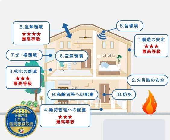| 設備 | 長期優良住宅認定通知書 / 設計住宅性能評価書 / 建設住宅性能評価書(新築時) / フラット35Sに対応 / 年内引渡可 / 駐車3台以上可 / スーパー 徒歩10分以内 / 南向き / システムキッチン / 浴室乾燥機 / 全居室収納 / LDK15畳以上 / 和室 / シャワー付洗面化粧台 / 対面式キッチン / セキュリティ充実 / ハイルーフ駐車場 / トイレ2ヶ所 / 浴室1坪以上 / 2階建 / 複層ガラス / オートバス / 温水洗浄便座 / 床下収納 / 浴室に窓 / TVモニタ付インターホン / ウォークインクローゼット / IHクッキングヒーター / リビング階段 / 全居室複層ガラスか複層サッシ / 都市ガス / 小学校 徒歩10分以内 / 食器洗乾燥機 / 浄水器 | ||||