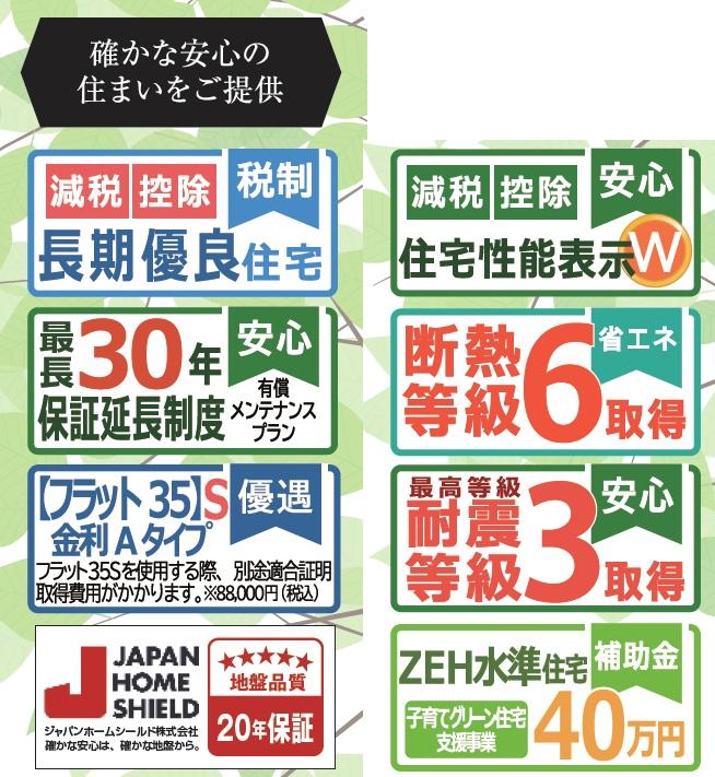 | 設備 | 長期優良住宅認定通知書 / 設計住宅性能評価書 / 建設住宅性能評価書(新築時) / フラット35・S適合証明書 / フラット35Sに対応 / 地盤調査済 / 駐車3台以上可 / 即引渡可 / 土地50坪以上 / 年度内引渡可 / 山が見える / スーパー 徒歩10分以内 / 市街地が近い / 南向き / システムキッチン / 浴室乾燥機 / 陽当り良好 / 全居室収納 / 駅まで平坦 / 南側道路面す / 閑静な住宅地 / LDK15畳以上 / 前道6m以上 / 角地 / 和室 / 整形地 / 庭 / シャワー付洗面化粧台 / 対面式キッチン / トイレ2ヶ所 / 浴室1坪以上 / 2階建 / 南面バルコニー / 複層ガラス / オートバス / 温水洗浄便座 / 床下収納 / 浴室に窓 / TVモニタ付インターホン / 前面棟無 / 通風良好 / 全居室フローリング / パントリー(食器・食品の収納庫) / ウォークインクローゼット / 全居室6畳以上 / 全居室複層ガラスか複層サッシ / 都市ガス / 小学校 徒歩10分以内 / 浄水器 / スマートキー | ||||