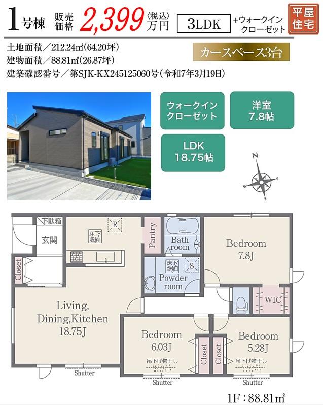 | 建物面積 | 88.81㎡~100.19㎡(26.86坪~30.30坪) | 土地面積 | 205㎡~212.24㎡(62.01坪~64.20坪) | ||