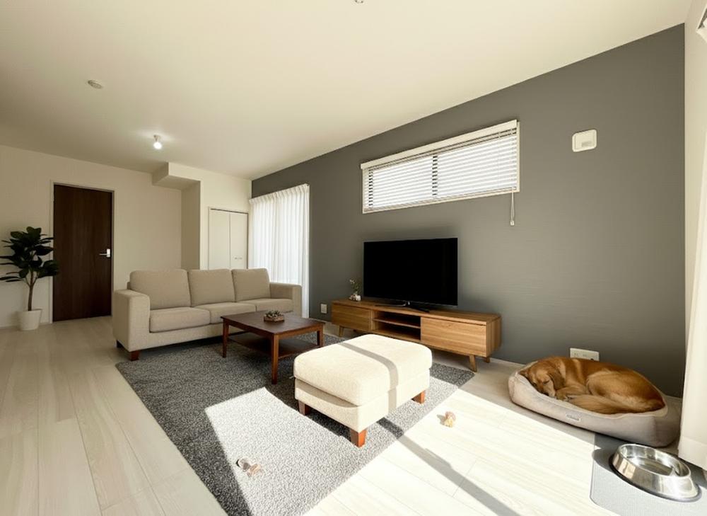 家具を合わせやすい色味のフローリング、アクセントクロスはスタイリッシュな雰囲気を演出します。大きな窓から陽光が差し込み、日中は照明いらずの明るさです。シャッター標準装備。(イメージ家具と犬はCGです)