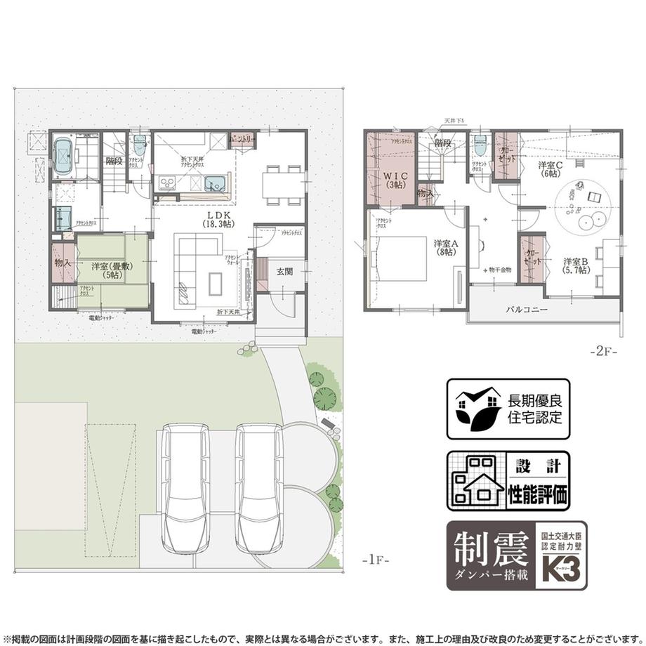 | 設備 | 長期優良住宅認定通知書 / 設計住宅性能評価書 / 省エネルギー対策 / 地盤調査済 / 駐車2台可 / 土地50坪以上 / LDK18畳以上 / 省エネ給湯器 / システムキッチン / 浴室乾燥機 / 陽当り良好 / 全居室収納 / 南側道路面す / 和室 / 整形地 / シャワー付洗面化粧台 / 対面式キッチン / ワイドバルコニー / バリアフリー / トイレ2ヶ所 / 浴室1坪以上 / 2階建 / 南面バルコニー / 複層ガラス / オートバス / 温水洗浄便座 / 南庭 / 浴室に窓 / TVモニタ付インターホン / 節水型トイレ / 通風良好 / 南西向き / パントリー(食器・食品の収納庫) / ウォークインクローゼット / 全居室6畳以上 / IHクッキングヒーター / 全居室複層ガラスか複層サッシ / シューズインクローク / 全室南西向き / 食器洗乾燥機 / 隣家との間隔が大きい / オール電化 / 浄水器 / スマートキー / 高機能トイレ | ||||