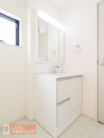 【洗髪洗面化粧台】ゆとりの洗面スペースで朝の身支度も快適スムーズ。3面鏡で髪のセットやお化粧もストレスなくこなせれば、気分良く通勤通学に向かえます♪鏡の裏はたっぷりと収納スペースを標準装備♪