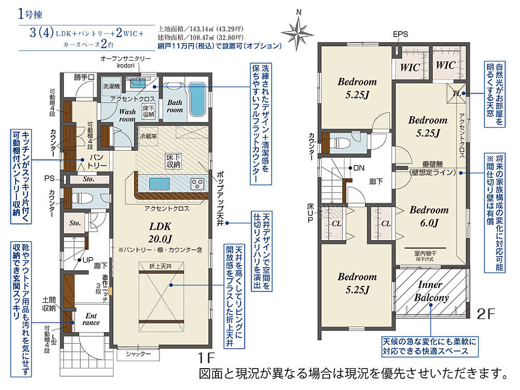 | 建物面積 | 108.47m2(約32.81坪)~122.02m2(約36.91坪) | 土地面積 | 133.53m2(約40.39坪)~143.14m2(約43.29坪) | ||