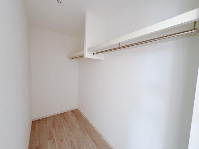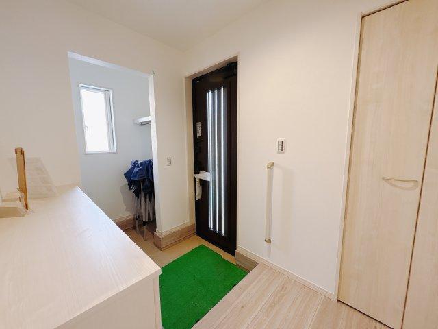 〇1号棟〇 玄関入って右手には大容量シューズインクローゼット!靴だけでなく傘・ベビーカー・アウトドア用品などもまとめて収納できて◎ コートなどを掛けられるハンガーパイプ付きです! ※2026年1月撮影