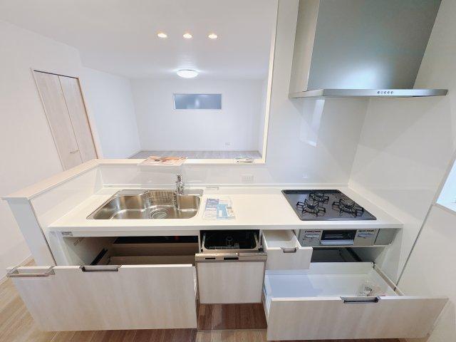 〇2号棟・キッチン〇 キッチンからリビングを見渡すことができ、家事をしながらお子様がお友達と遊んでいる様子や宿題をしている様子を見守ることができます♪ パントリーも付いています! ※2026年1月撮影