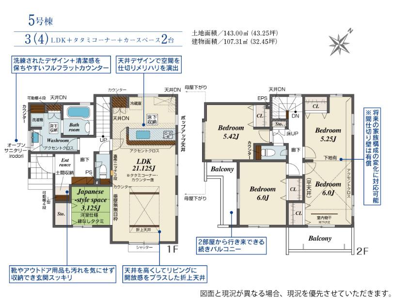 | 建物面積 | 107.31㎡(32.46坪)(登記) | 土地面積 | 143.05㎡(43.27坪)(登記) | ||