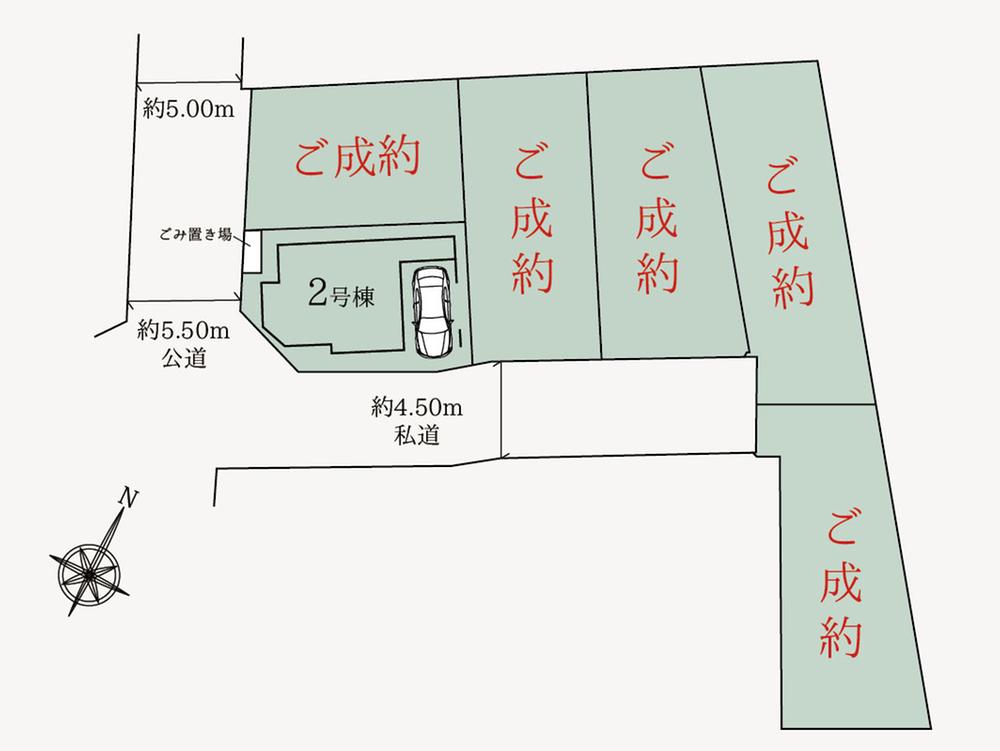 | 地目 | 宅地 | 道路付け | 道路幅:4.5m~5.5m、アスファルト舗装、南西側 5.50m 公道 4.50m 私道、【私道負担】117.89平米×1/8(2号棟)、【未利用地持分】1.7平米×1/8(2号棟)、【ゴミ置場持分】1.82平米×1/9 | ||