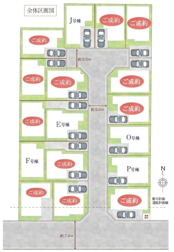| 地目 | 宅地 | 道路付け | 道路幅:5m~7.4m、アスファルト舗装、南側 7.40m、公道 5.00m 私道、【路地状部分】25平米(D号棟)・26平米(F号棟)含む | ||