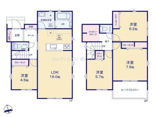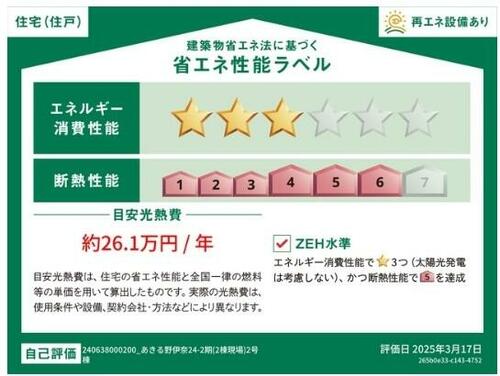 | 設備 | 収納スペース・追焚機能・フローリング・浴室乾燥機・Wクロゼット・シャンプードレッサー・ウォシュレット・システムキッチン・モニタ付インターホン・クロゼット・トイレ2ヶ所・床下収納・ルーフバルコニー・浄水器・食器洗浄乾燥機・複層ガラス・ディンプルキー・太陽光発電システム | ||||