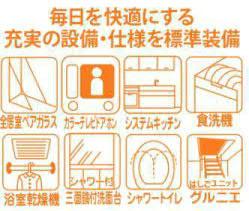 | 設備 | フラット35・S適合証明書 / 2沿線以上利用可 / システムキッチン / 浴室乾燥機 / 陽当り良好 / LDK15畳以上 / 前道6m以上 / シャワー付洗面化粧台 / 対面式キッチン / 浴室1坪以上 / 2階建 / オートバス / 浴室に窓 / TVモニタ付インターホン / 通風良好 / 全居室フローリング / リビング階段 / 全居室複層ガラスか複層サッシ / 都市ガス / ルーフバルコニー / 食器洗乾燥機 / 浄水器 / 高機能トイレ / ビルトインガレージ | ||||