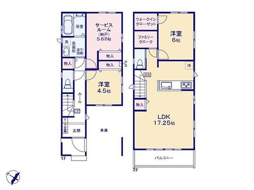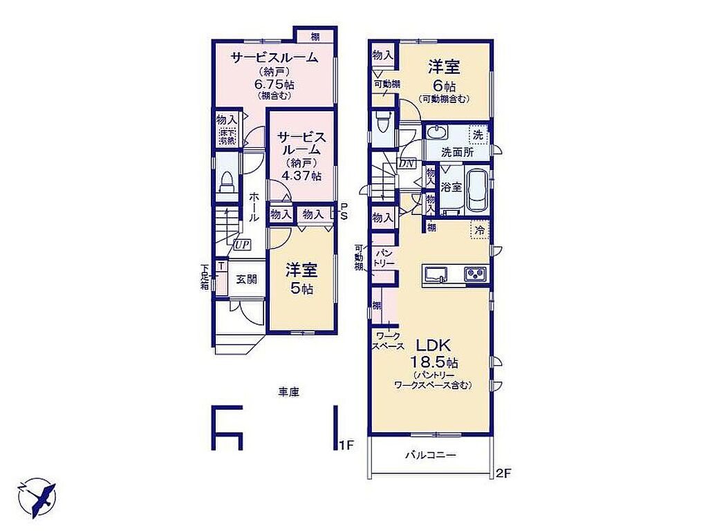 ≪F号棟間取図≫2階に設けたLDKにはワークスペース、キッチンパントリーを完備!水廻りスペースも2階に設け、上下階の移動がないのでバルコニーにすぐに干せます♪