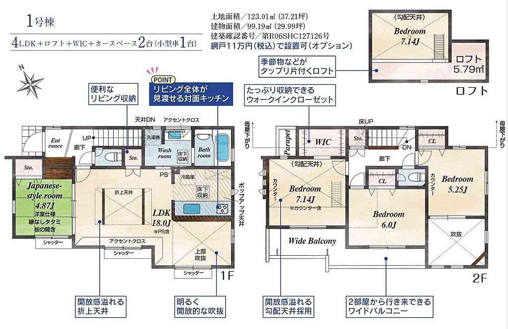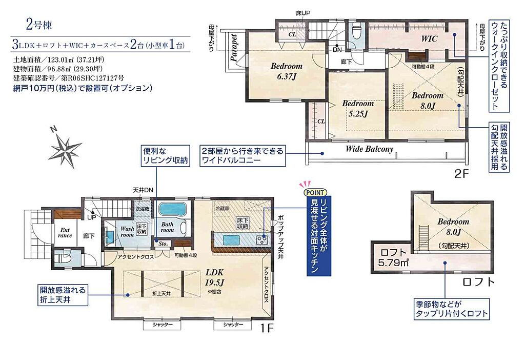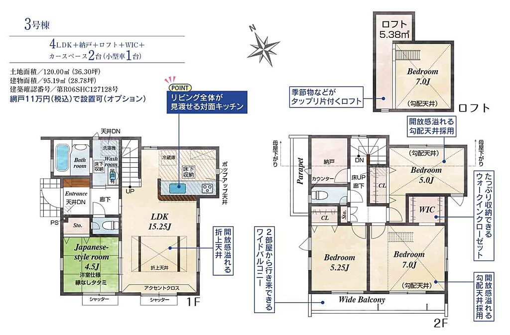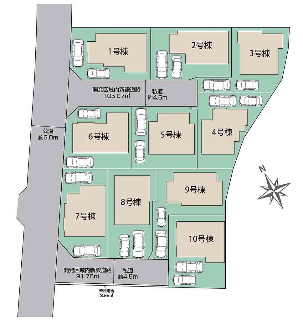 建物面積 | 95.19m2~99.19m2 | 土地面積 | 120m2~123.01m2<私道負担面積105.07m2 私道負担割合1/6> | ||