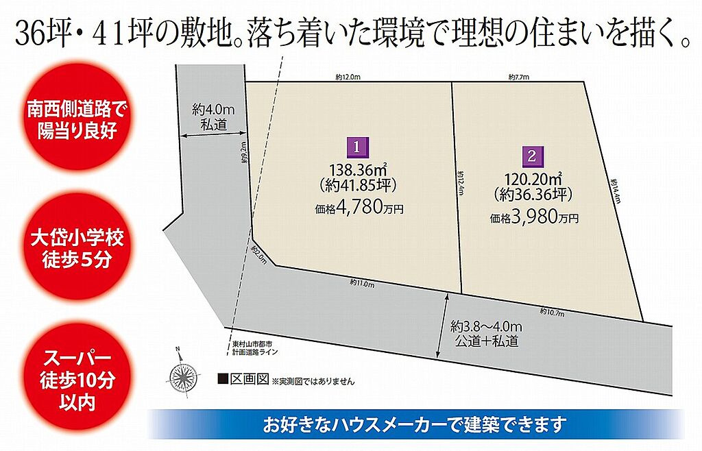 西武新宿線「久米川」駅から徒歩9分の利便性ある立地。大岱小学校・東村山第五中学校の通学エリア内で、子育て世帯にも安心の環境です。 周辺は落ち着いた住宅街、敷地面積は約36坪・41坪の2区画です。 敷地面積は約36坪・41坪の2区画。周辺は落ち着いた住宅街が広がり、ゆったりとした住まいのプランニングが可能です。 南西側道路に面しており、日当たりの良さもポイント。スーパーが徒歩10分圏内に揃い、日々のお買い物にも便利です。 建築条件はなく、設計・施工会社を自由に選択可能です | ||||