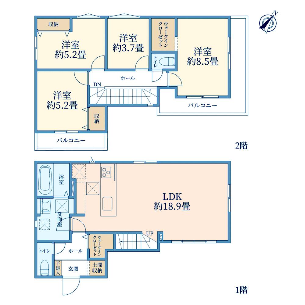 2沿線以上利用可 / LDK18畳以上 / スーパー 徒歩10分以内 / システムキッチン / 浴室乾燥機 / 陽当り良好 / 全居室収納 / 閑静な住宅地 / 整形地 / シャワー付洗面化粧台 / 対面式キッチン / 3面採光 / トイレ2ヶ所 / 浴室1坪以上 / 2階建 / 2面以上バルコニー / 東南向き / 南面バルコニー / 複層ガラス / 温水洗浄便座 / 床下収納 / TVモニタ付インターホン / ウォークインクローゼット / リビング階段 / 都市ガス / 小学校 徒歩10分以内 / 平坦地 / 床暖房 / 食器洗乾燥機 / 整備された歩道