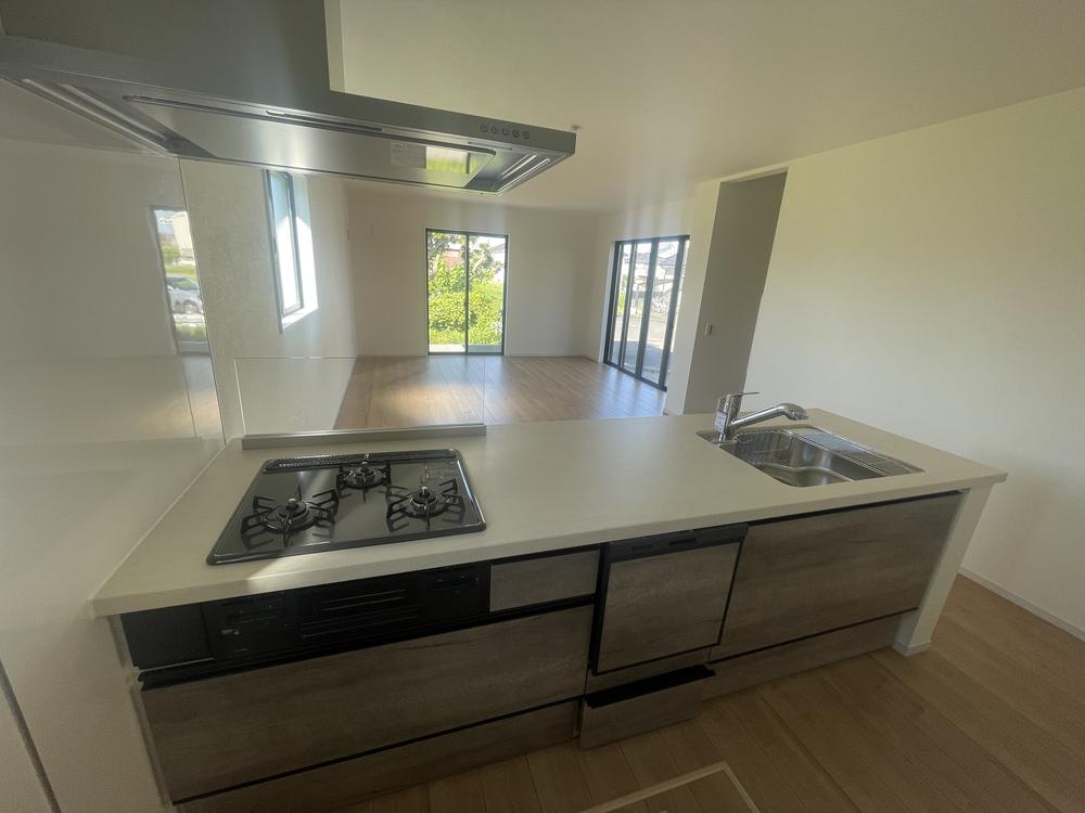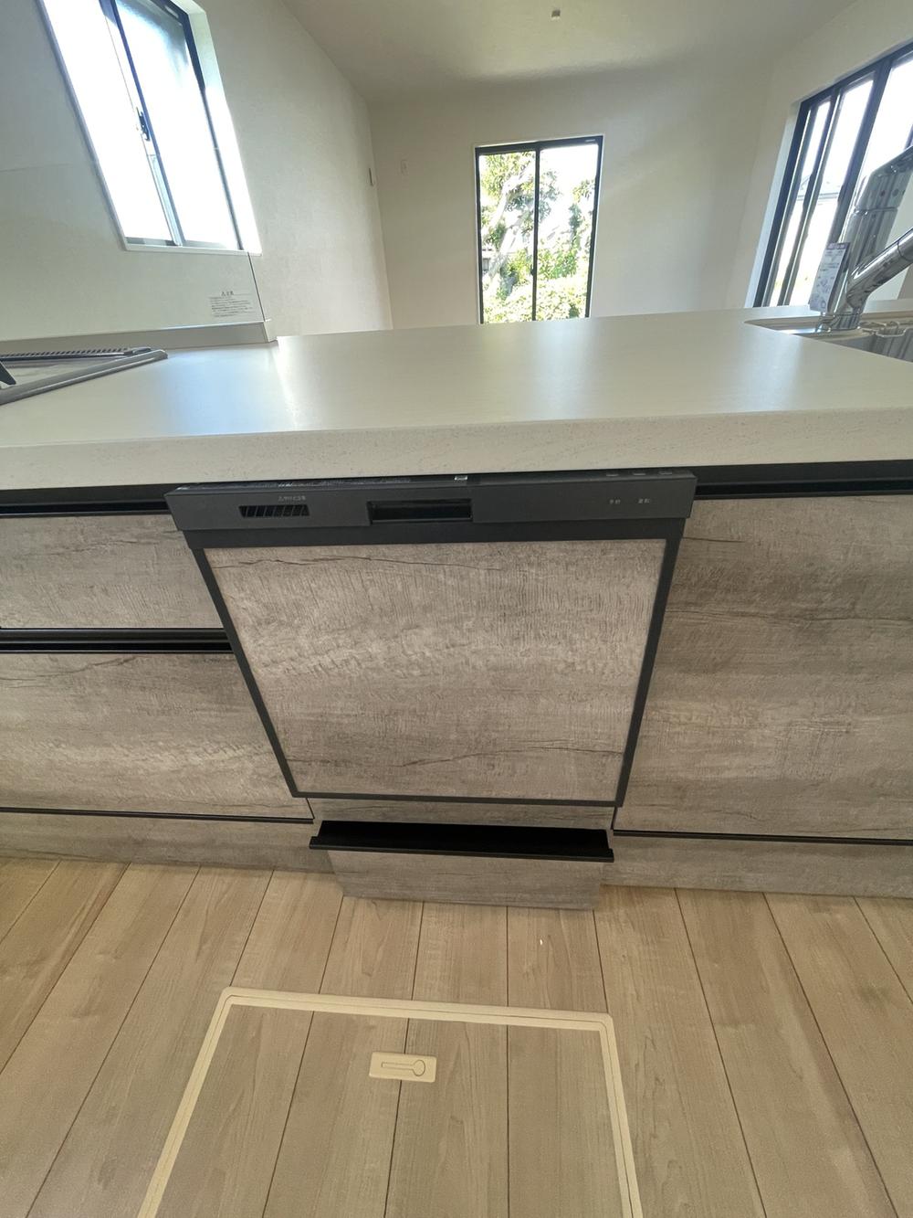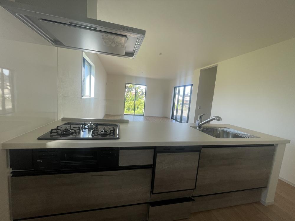 リビングとの雰囲気に合うキッチンには、食洗機を標準装備。シンク下の収納は、全体を見ることができ、奥の物も取り出しやすいオールスライドタイプです。キッチン(2025年7月)撮影