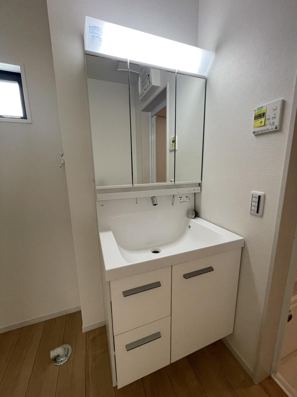 清潔感のある洗面室は3面鏡付き洗面台を設置。自然光が射し込む窓付きです。鏡裏にも収納があり、化粧品や洗面グッズも収まります。すっきりとした洗面スペースを保てますね。洗面室(2025年8月)撮影