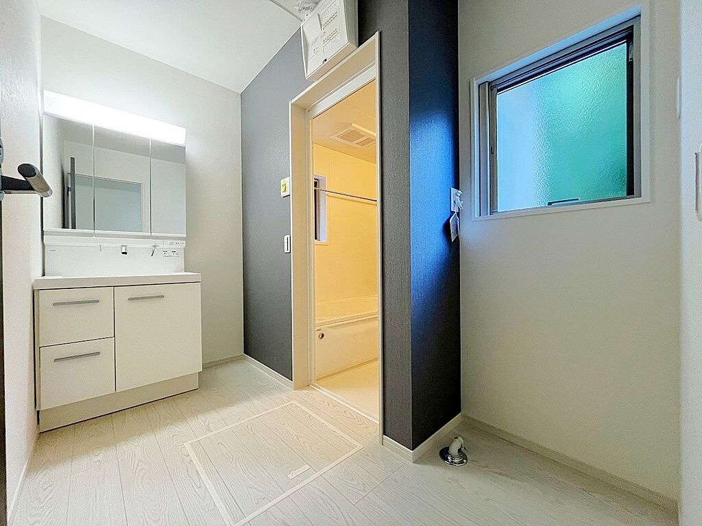 鏡の裏に収納棚を確保した三面鏡を採用。小窓付きの洗面室は、毎朝心地よい光と爽やかな風を運んでくれます。お手入れしやすいシンプルな洗面化粧台は、鏡の裏も収納です。
