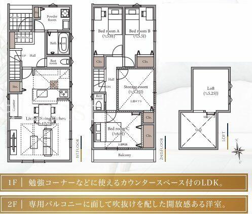 | 備考 | 新築高級デザイナーズ戸建て・駐車場2台・地盤保証・長期優良住宅認定・省エネ・フラット35S・南向き・通風・陽当たり良好・トイレ2ヶ所・吹抜・ロフト付・収納も広々 | ||||