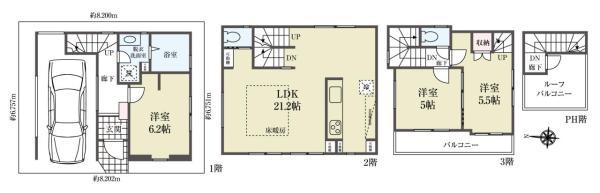 建物面積 | 102.61㎡(実測)、うち1階車庫14.07㎡ | 土地面積 | 55.39㎡(実測) | ||