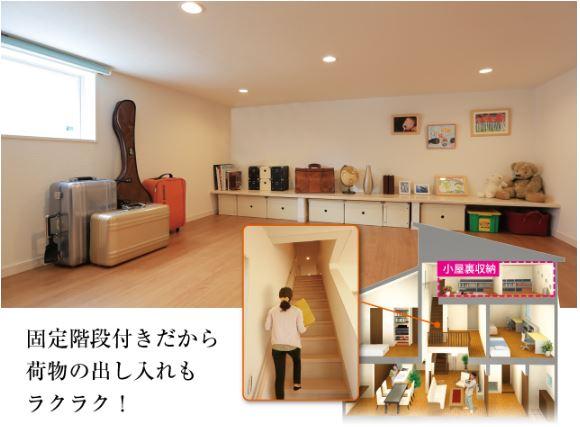 【固定階段付き小屋裏収納】「収納は欲しいけど、部屋がせまくなるのはイヤ・・・」という声を良く聞きます。そんな悩みを一気に解決するのが、屋根下の空間を有効活用した小屋裏収納です。※画像はイメージです。