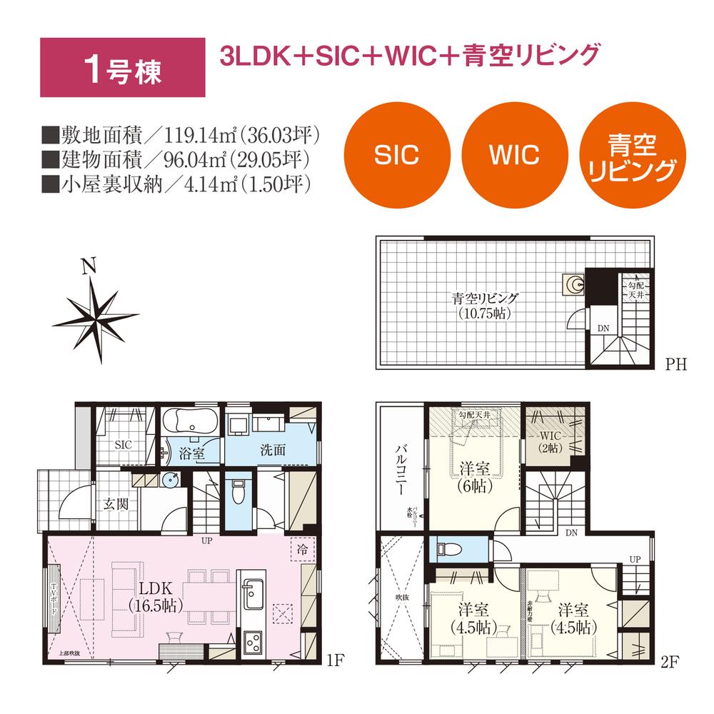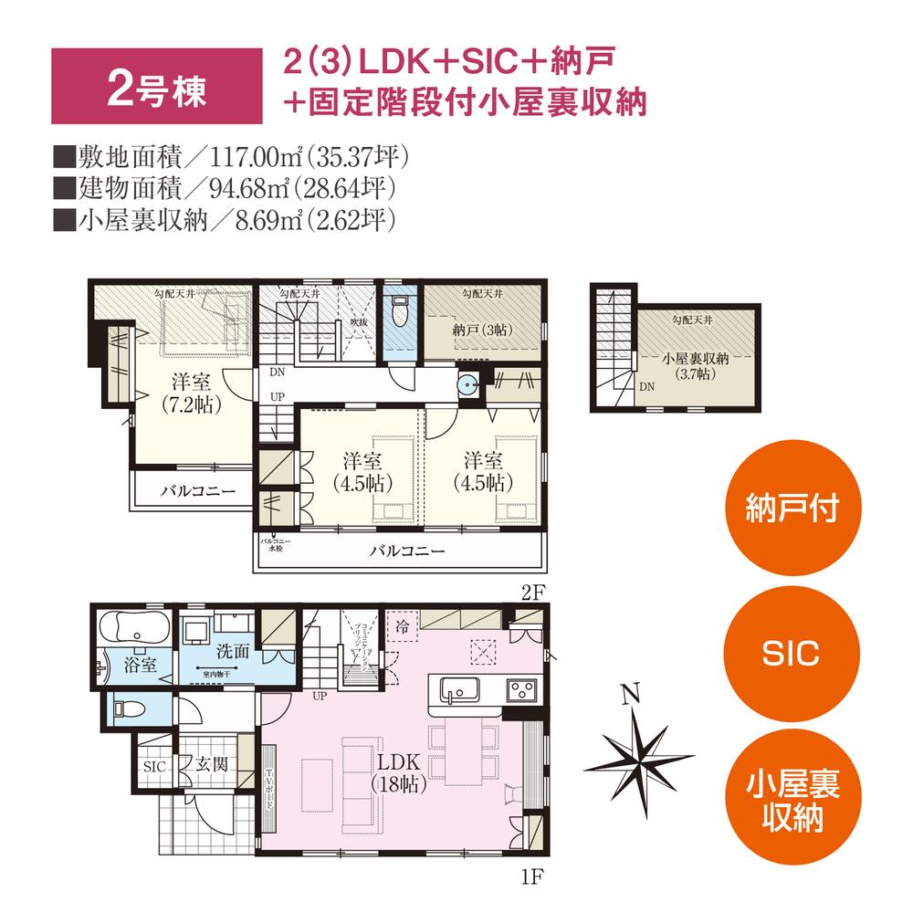 建物面積 | 94.68㎡・96.04㎡(28.64坪・29.05坪) | 土地面積 | 117㎡・119.14㎡(35.39坪・36.03坪)(登記) | ||