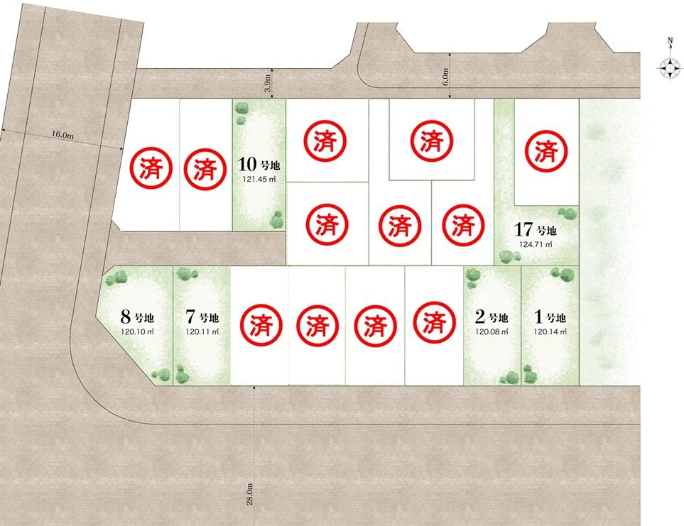 | 地目 | 宅地 | 道路付け | 道路幅:4.5m~28m、アスファルト舗装、北側6.00m公道・南側28.00公道・西側16.00m公道・新設道路4.5m私道 | ||