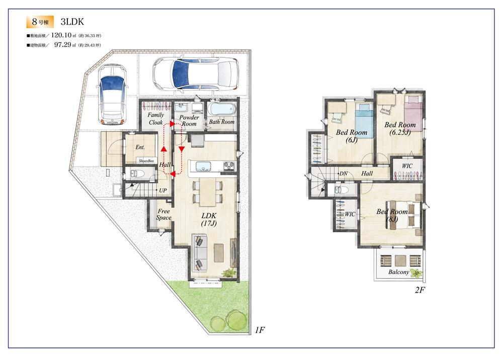 | 建物面積 | 95.84㎡~100.19㎡(実測) | 土地面積 | 120.08㎡~124.71㎡(実測) | ||