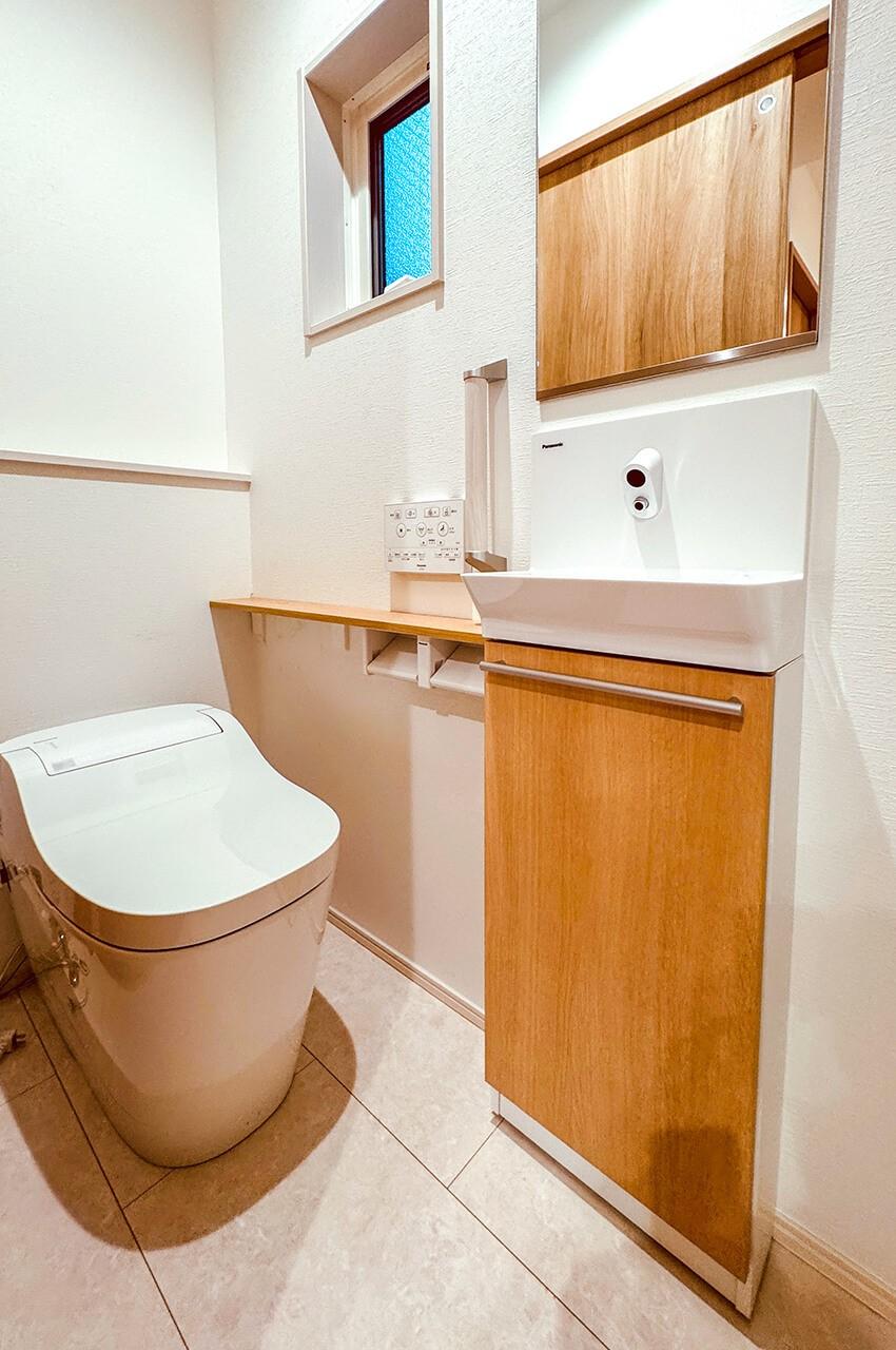 【全自動おそうじトイレアラウーノ】と手洗いキャビネットを採用。流すたびに“泡”でおそうじします。1F手洗いキャビネットはタッチレス水栓。※画像は建築事例です。販売中の建物とは仕様は異なります。