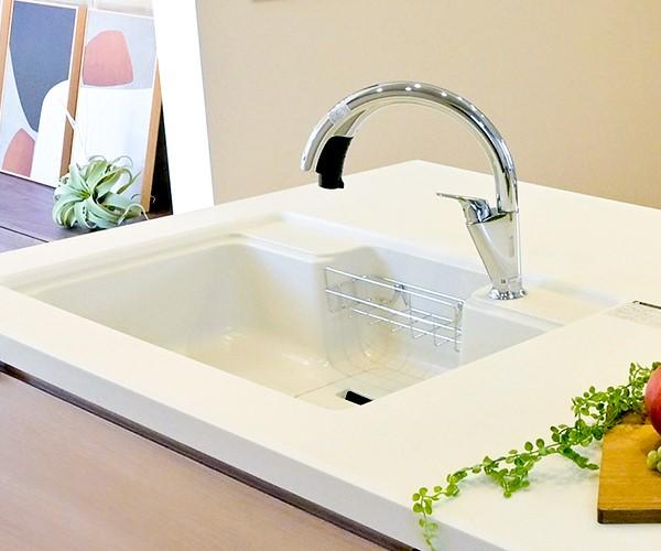【タッチレス浄水栓】吐水、止水が自動で水栓操作が不要に。【人大シンク】耐久性に優れた、美しくなめらかな質感の人工大理石。※画像は建築事例です。販売中の建物とは仕様は異なります。