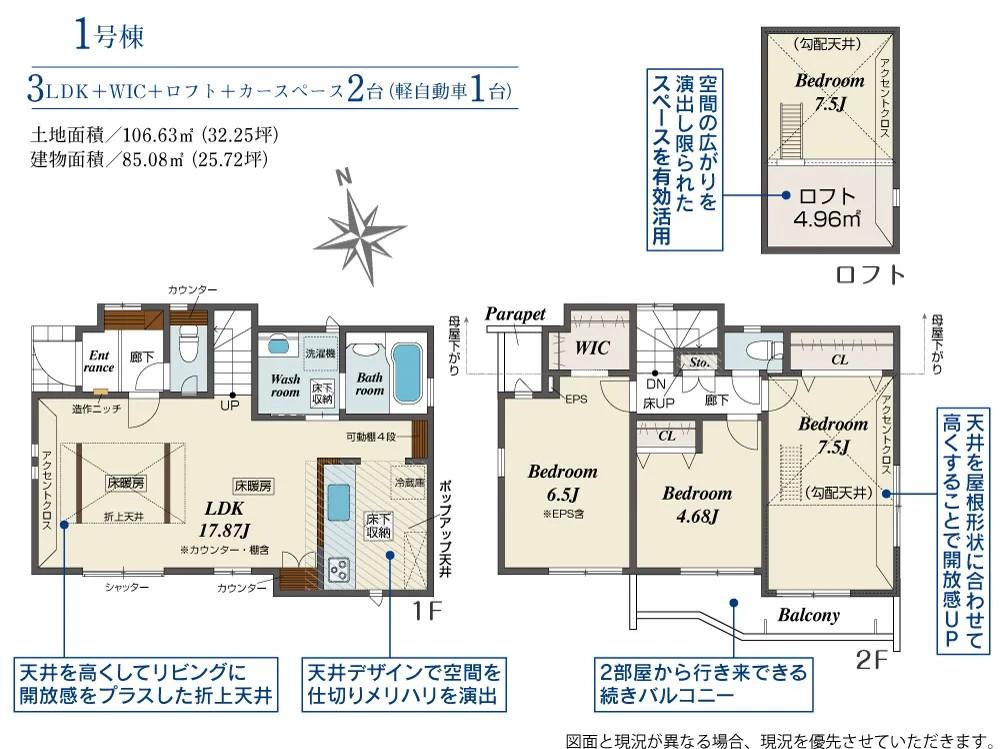 ※土地(建築条件なし)で「建物プラン例」が表記してある時、そのプラン例は特定の建築請負会社によるもので、当該建築請負会社以外で建てた場合、同様のものが同価格で建てられるとは限りません。また建築請負会社を特定するものではありません。