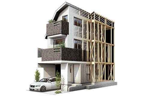 外周部に、厚さ9mmの構造板を施工。建物全体を面で覆った箱状の構造は、わが国古来の木造軸組工法と、欧米で普及している2×4工法(枠組壁工法)とのハイブリッドとも呼べるものです。地震や台風時などに発生する「横方向」の力を分散して受け止め、万が一の際にも安全性の高い建物を実現しました。