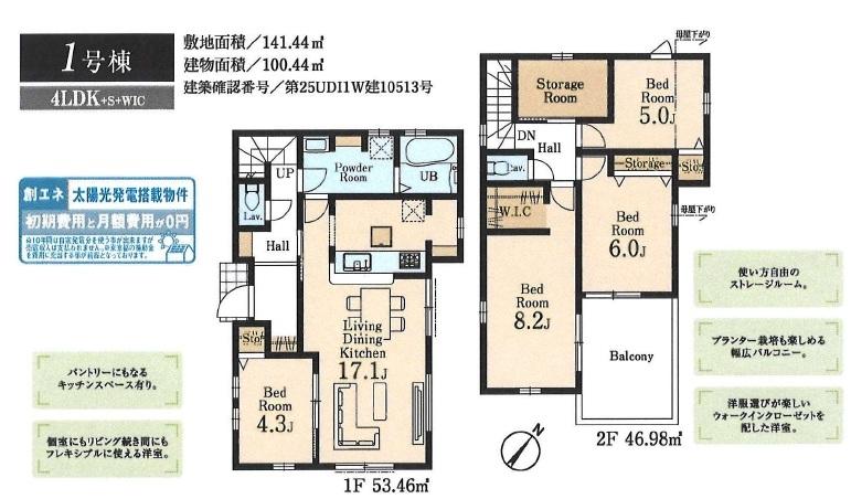| 設備 | フラット35Sに対応 / 太陽光発電システム / 駐車2台可 / 2沿線以上利用可 / システムキッチン / 浴室乾燥機 / 陽当り良好 / 全居室収納 / 閑静な住宅地 / LDK15畳以上 / 前道6m以上 / 角地 / 庭 / シャワー付洗面化粧台 / ワイドバルコニー / トイレ2ヶ所 / 浴室1坪以上 / 2階建 / オートバス / 温水洗浄便座 / 床下収納 / TVモニタ付インターホン / 全居室フローリング / アイランドキッチン / パントリー(食器・食品の収納庫) / ウォークインクローゼット / リビング階段 / 全室2面採光 / ルーフバルコニー / 平坦地 / 納戸 / 浄水器 | ||||