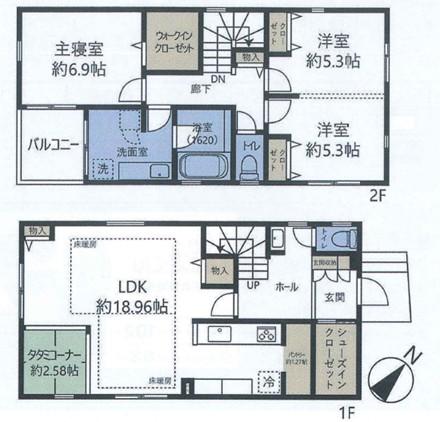 | 建物面積 | 107.02㎡~107.23㎡(実測) | 土地面積 | 150.19㎡~152.79㎡(実測) | ||