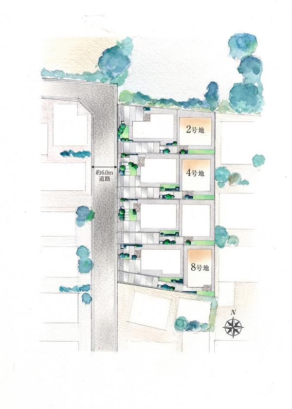 | 地目 | - | 道路付け | 道路幅:6m、アスファルト舗装、(2号地)、(4号地)、(8号地) 全て私道負担なし | ||