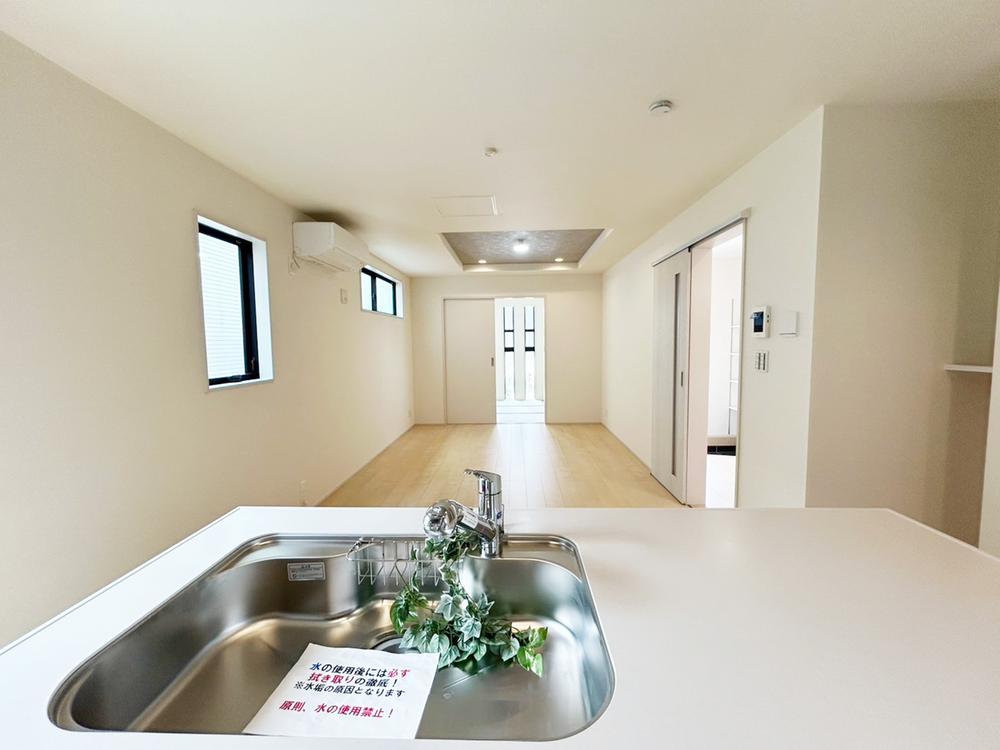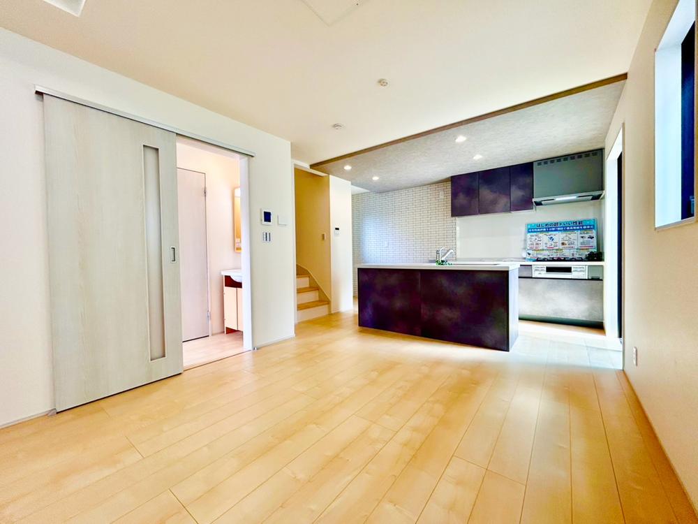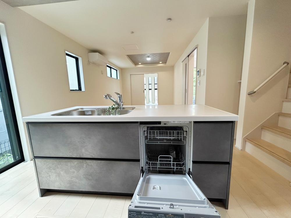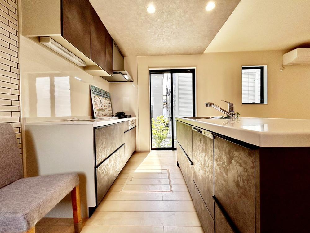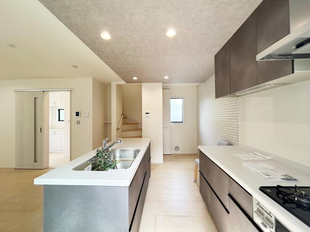 【アイランドキッチン】アイランドキッチンは、開放的な空間を演出し家族との会話も弾む設計です。調理動線がスムーズで作業効率も高く、ホームパーティや子育て世帯にもぴったりな快適さが魅力です。2号棟